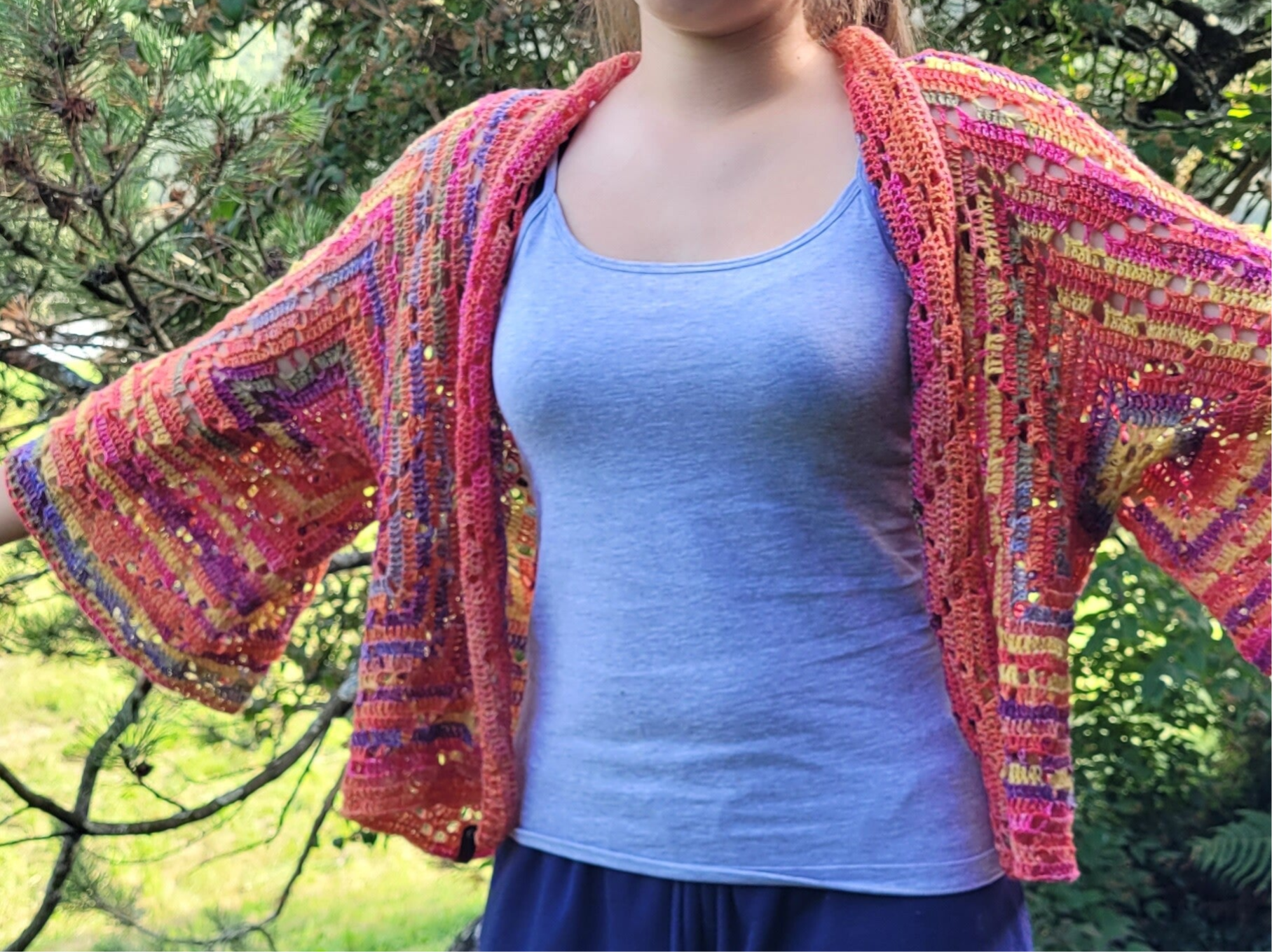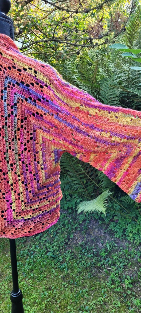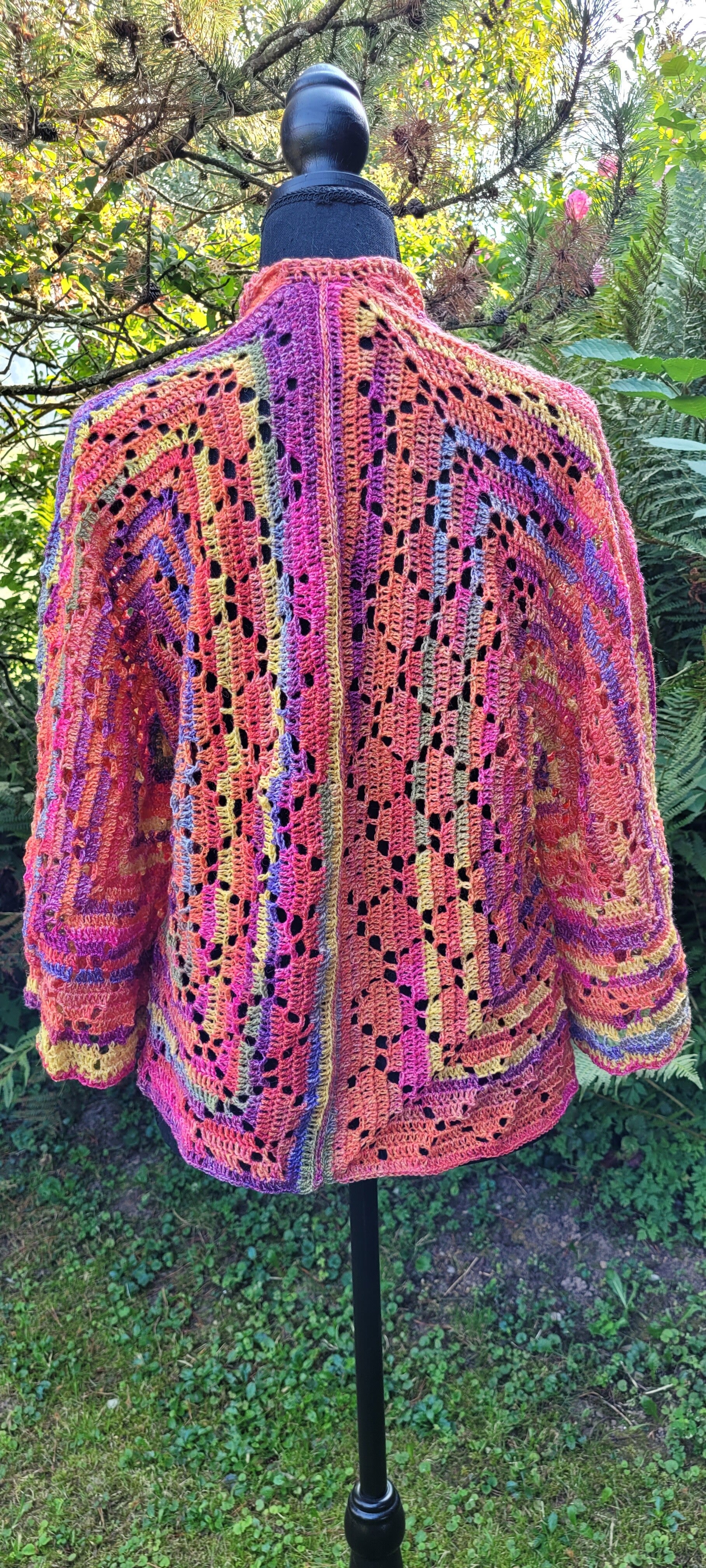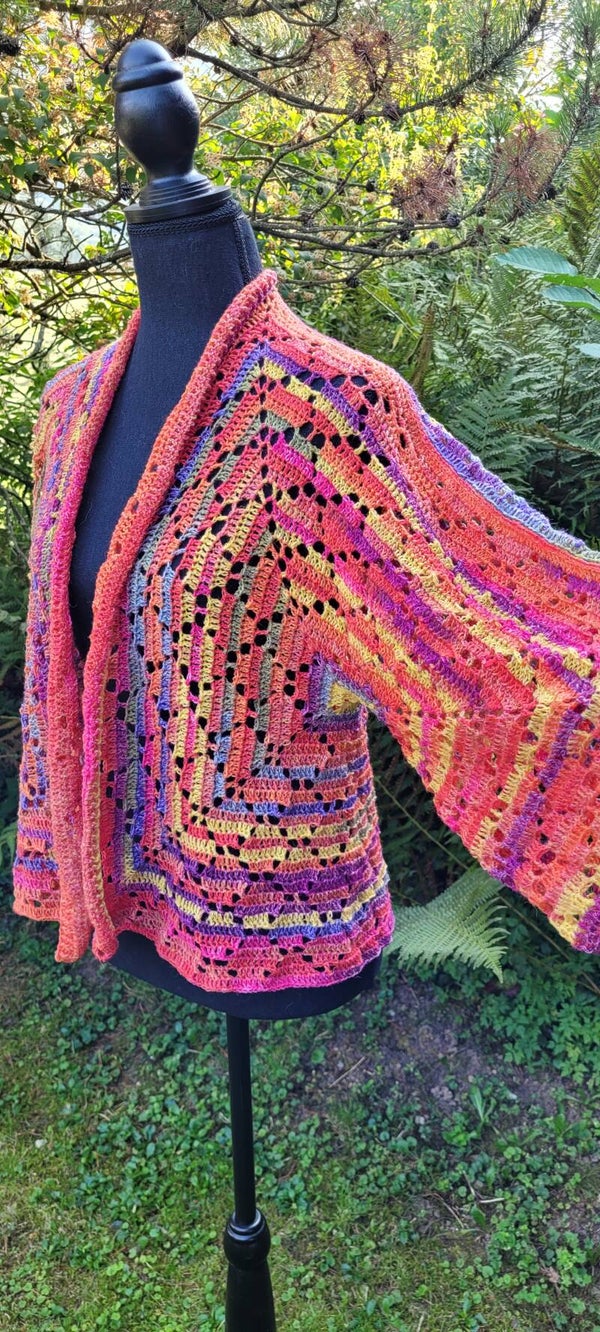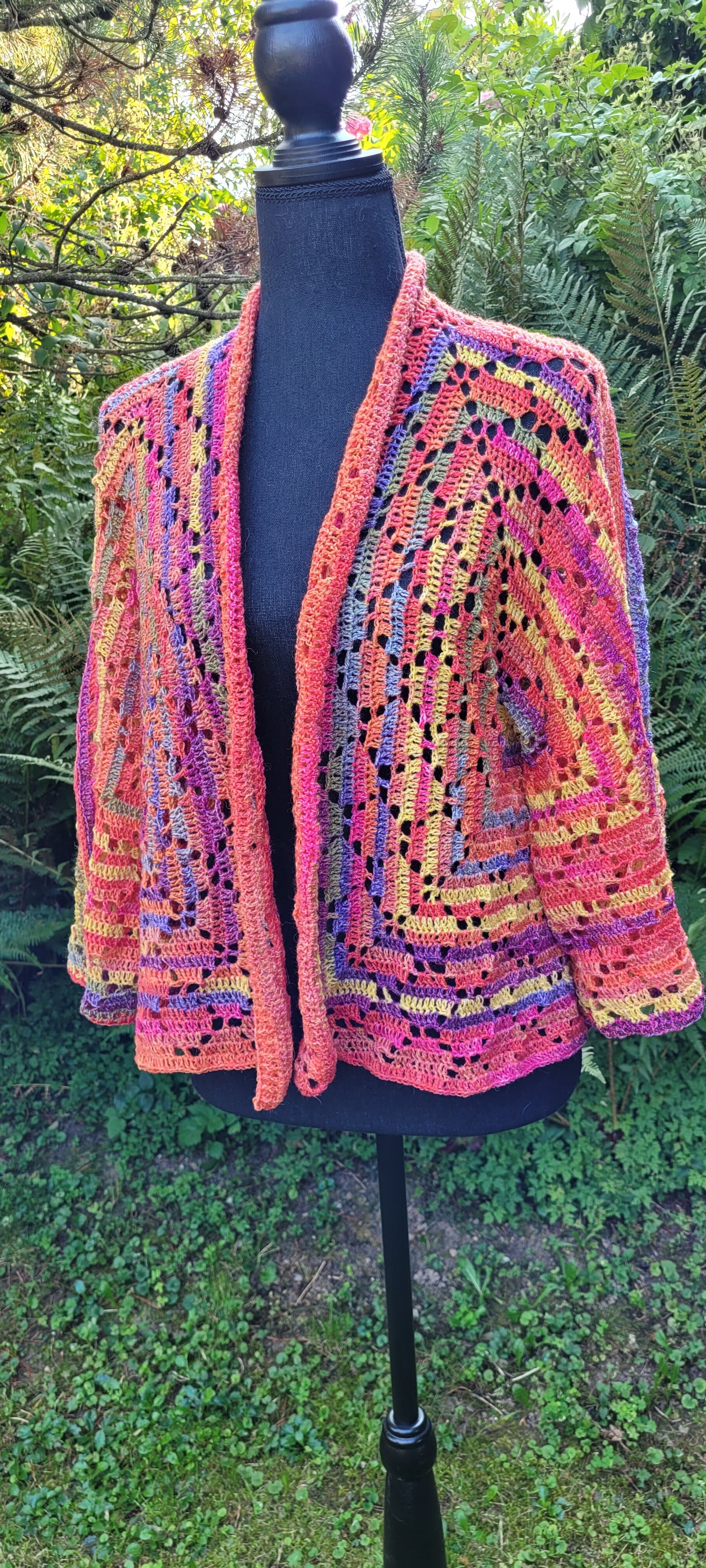 Mehrfarfbige Damen-Jacke aus Wolle. Diese Jacke ist perfekt für die Übergangszeit im Herbst. Sie ist leicht und bequem, aber trotzdem warm genug für kühlende Abende. Das einzigartige Design macht sie zu einem echten Hingucker!