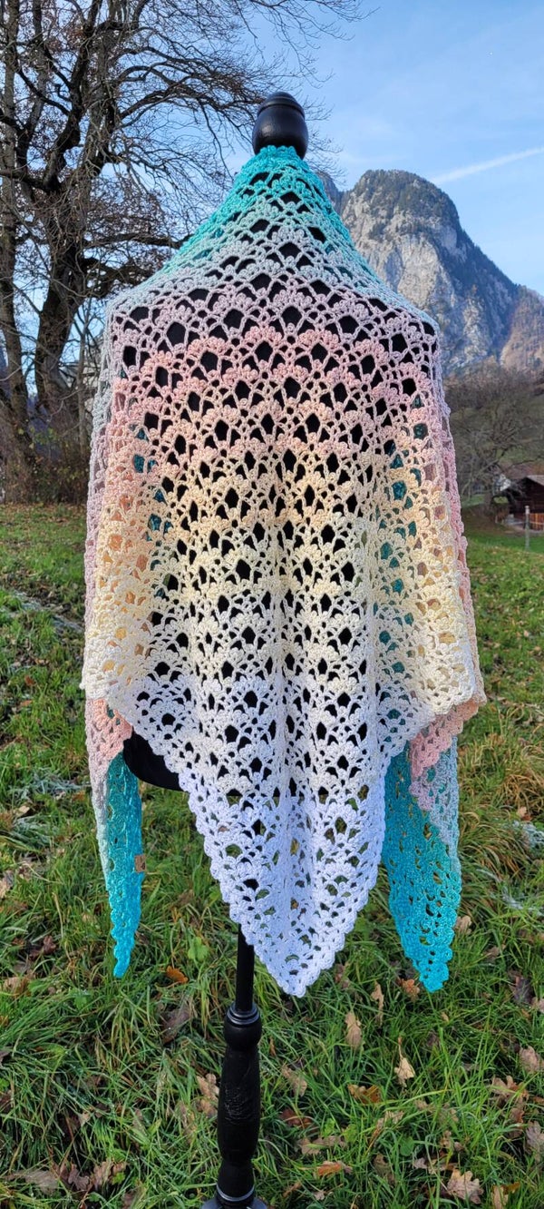 Dieser wunderschöne, handgemachte Dreieckstuch ist ein echter Hingucker. Das Dreieckstuch in sanften, mehrfarbigen Pastelltönen ist perfekt für den Frühling. Ideal, um jedes Outfit aufzuwerten!